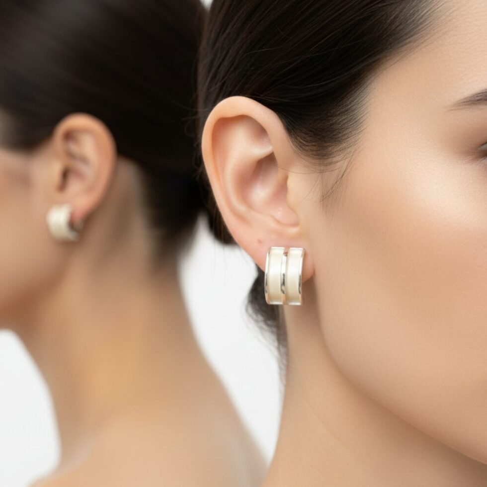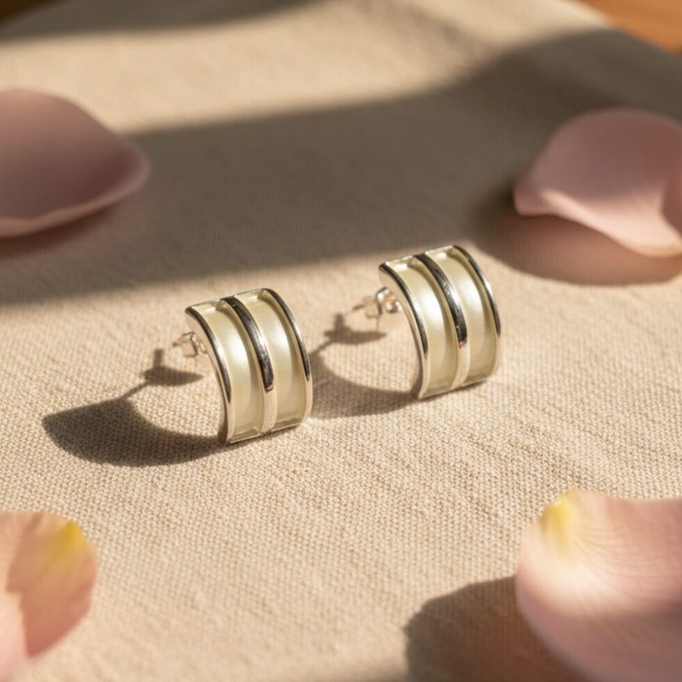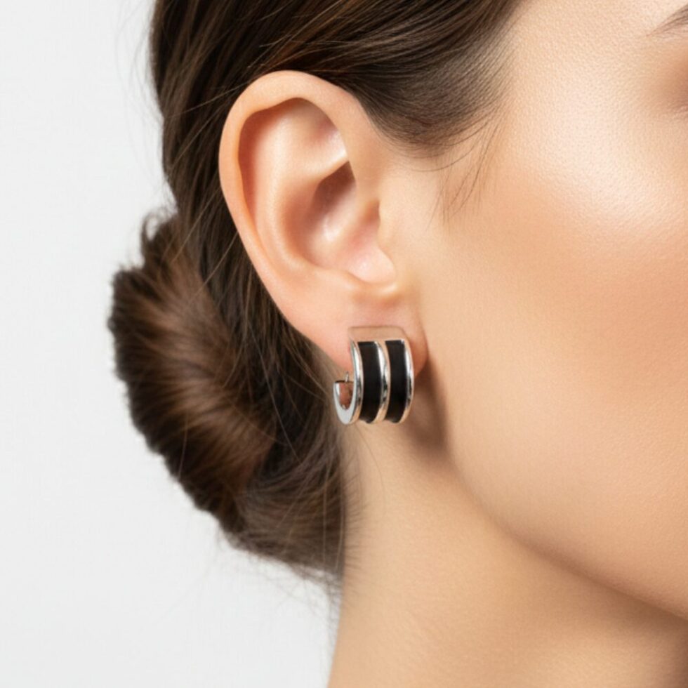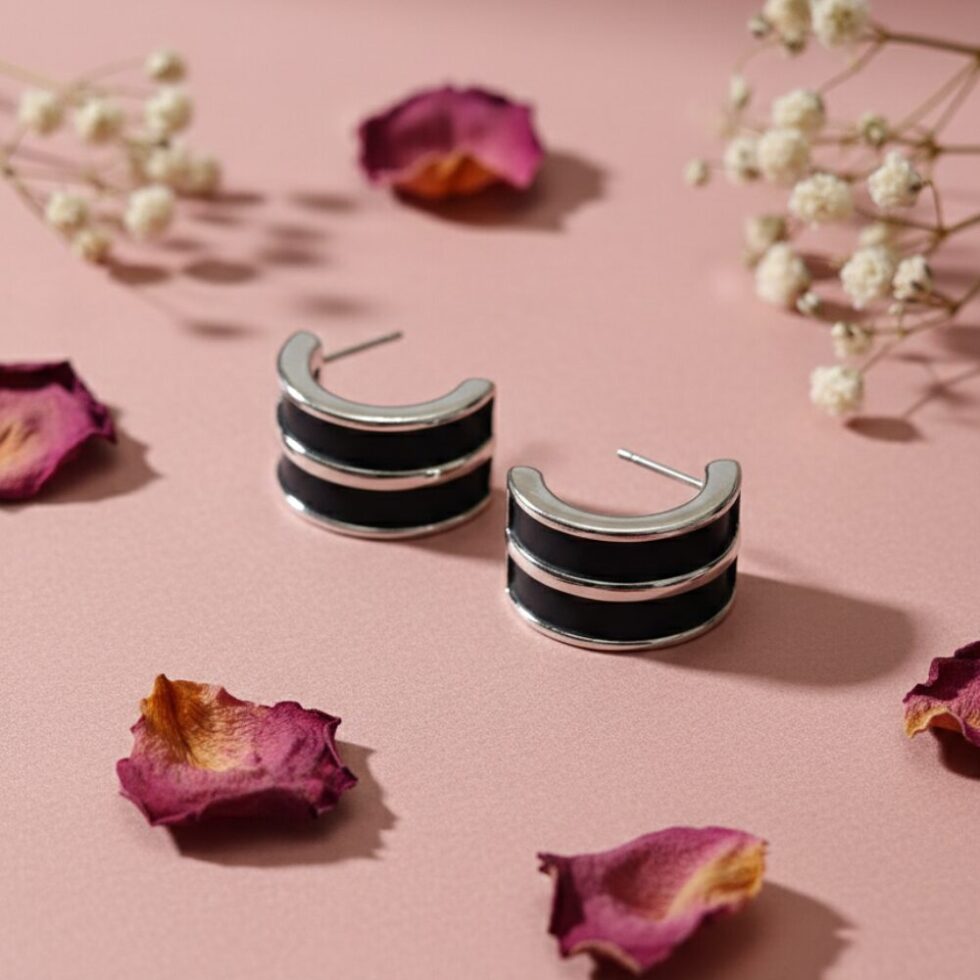 Make a bold yet elegant statement with these dual-tone curved half hoop earrings. Featuring a glossy black enamel center framed with a sleek silver finish, this design blends modern structure with timeless appeal. The curved silhouette enhances your look while remaining lightweight and comfortable for all-day wear. Perfect for work, casual outings, or evening styling.