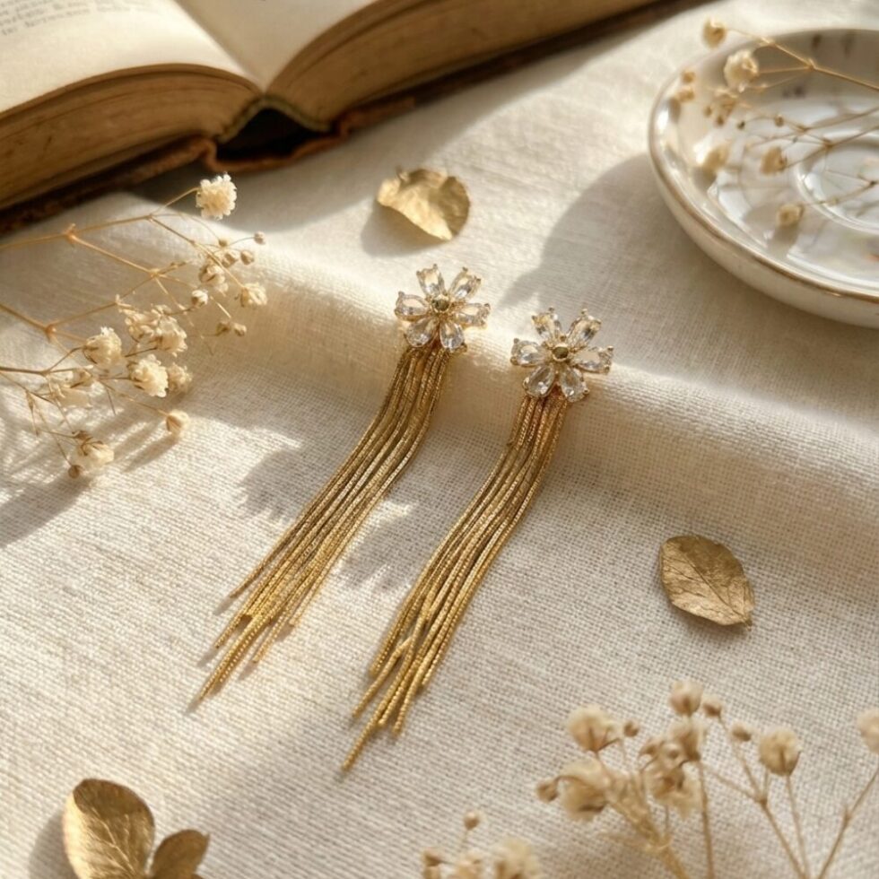 Be the first to review “Floral Crystal Tassel Drop Earrings – Gold Finish Statement Earrings” Cancel reply