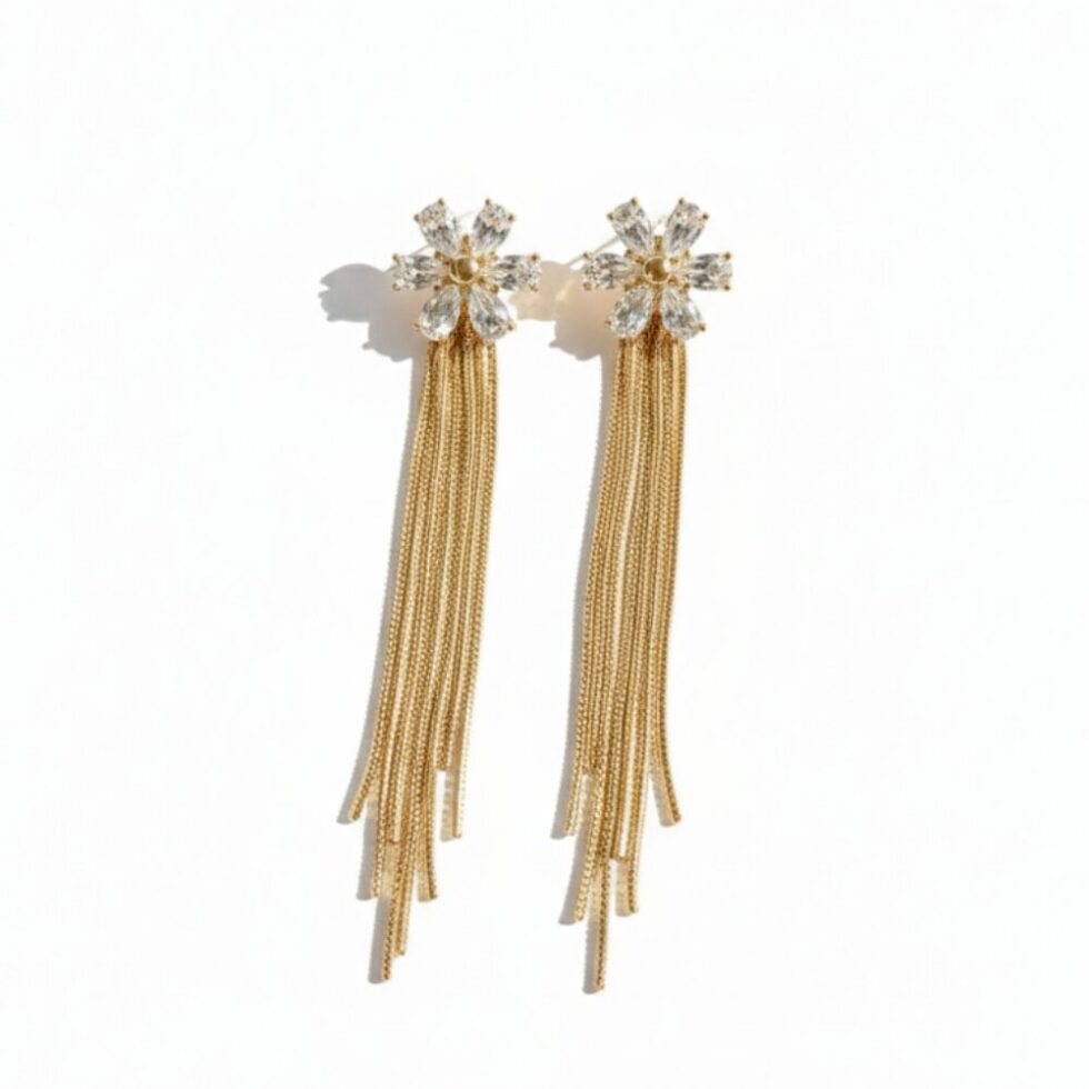 Elevate your festive and evening look with these stunning floral crystal tassel earrings. Designed with a sparkling flower-shaped stud adorned with precision-cut crystals, these earrings flow into elegant gold-tone chain tassels that create beautiful movement with every step.
