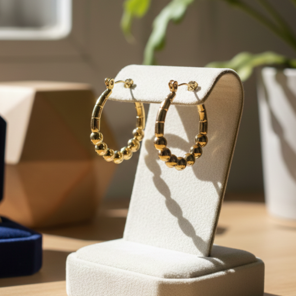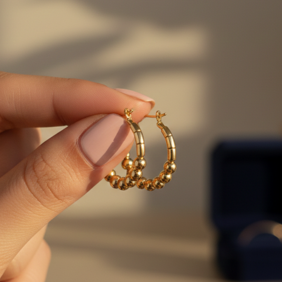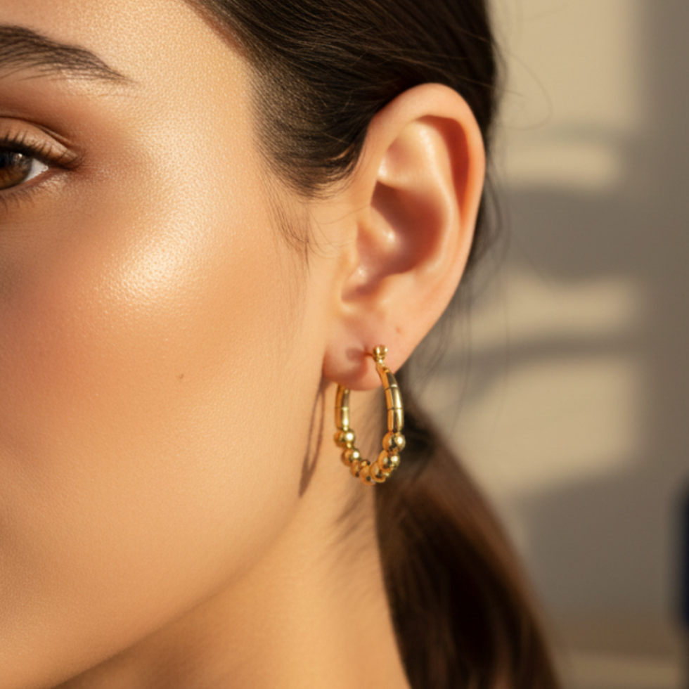 Tags:Beaded Gold Hoops, Bestseller, Braided Hoops, Gift for Her, Gold Bead Jewelry, Gold Hoop Earrings, High-Shine Gold Hoops., Minimalist Gold Jewelry, Minimalist Signature Jewelry, Office Wear Earrings, Party Accessories, Party Wear Earrings, Professional Office Jewelry, Signature Statement Earrings, Teardrop Earring Design, Trend, Twisted Gold Hoops