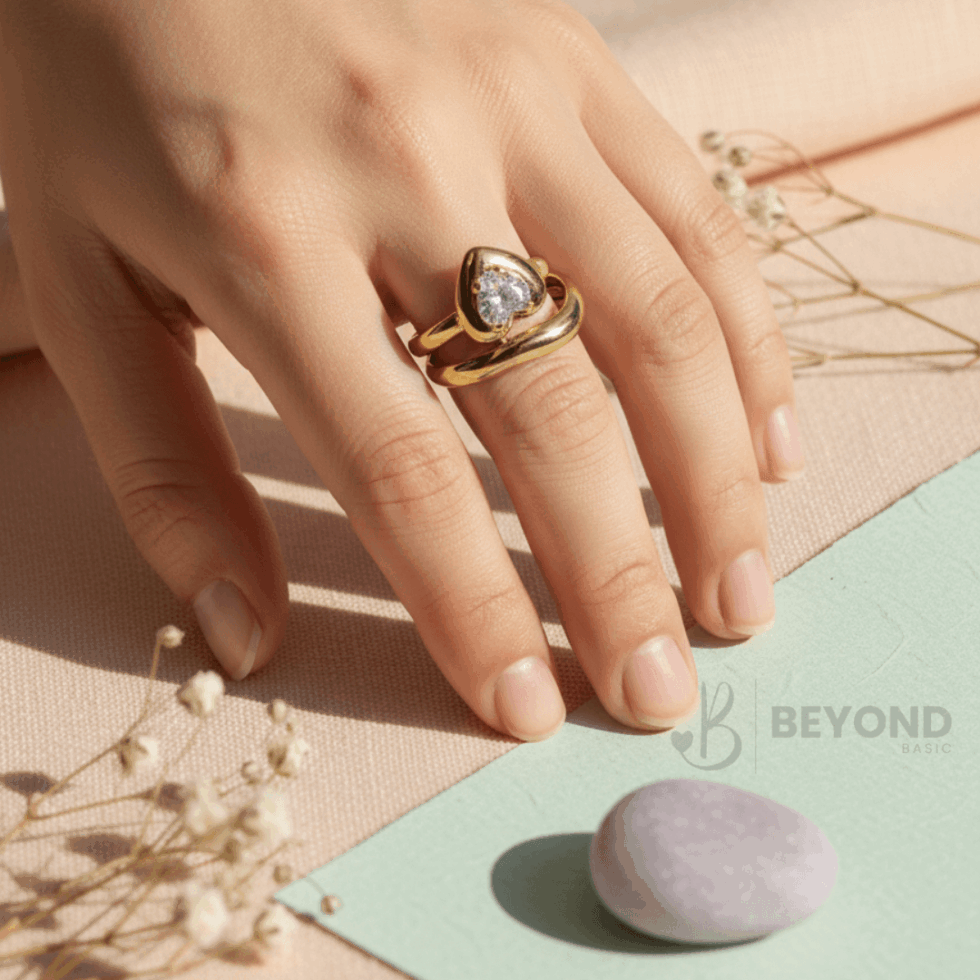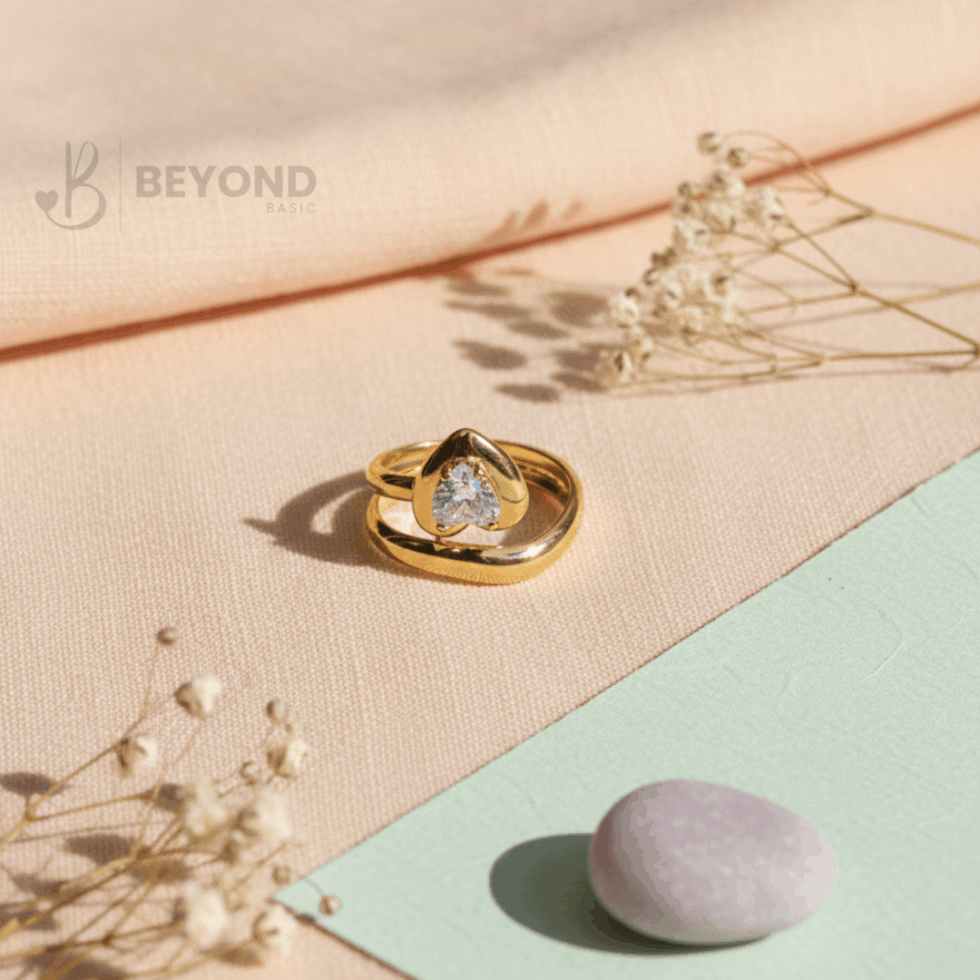 Delicate yet eye-catching, this Beyond Basic ring features a softly sculpted heart design accented with a clear crystal at its center. The smooth gold-tone band wraps elegantly around the finger, creating a balanced silhouette that feels both modern and romantic.