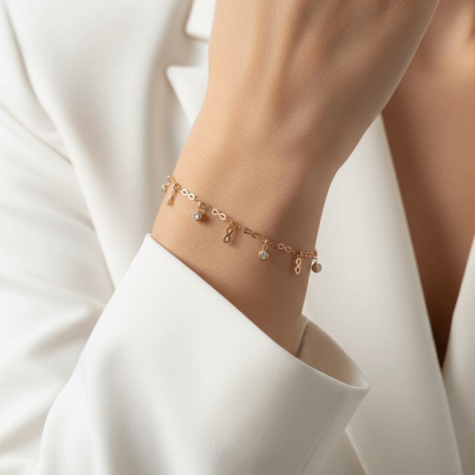Add a subtle touch of elegance to your everyday look with this beautifully crafted Minimal Infinity Charm Bracelet from Beyond Basic. Designed with a fine gold-finish chain, this bracelet features delicate infinity symbols paired with sparkling crystal drops for a refined and graceful appeal.