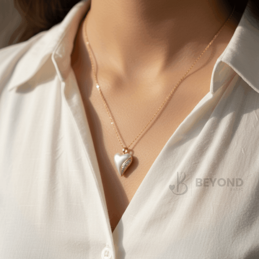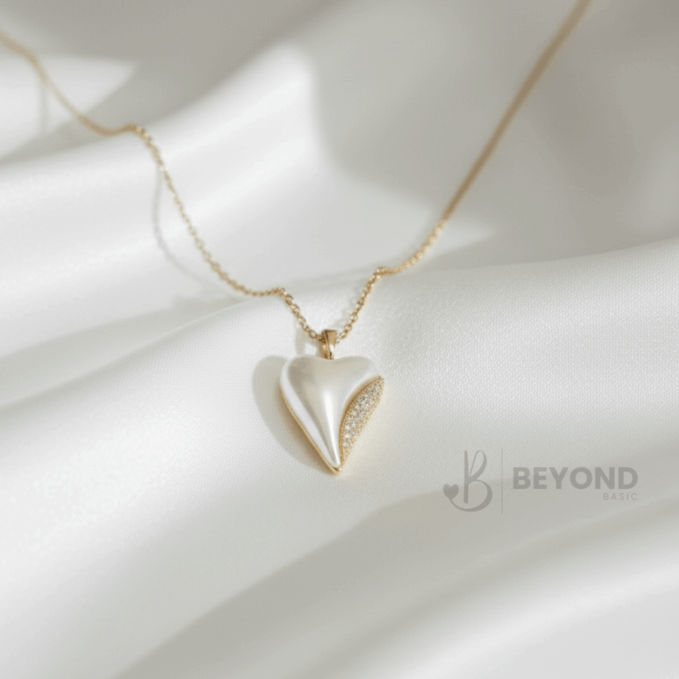 Elegant with a gentle edge, this Beyond Basic pendant features a heart-shaped pearl design finished with a subtle line of sparkle along one side. The smooth, luminous surface contrasts beautifully with the delicate crystal detailing, creating a piece that feels both classic and modern.