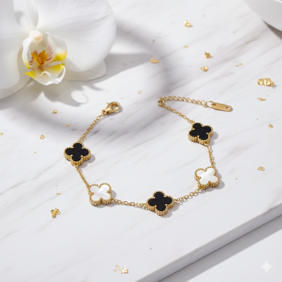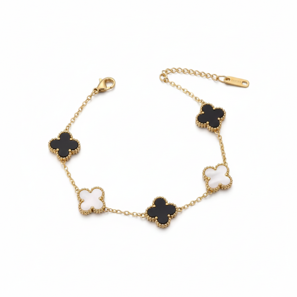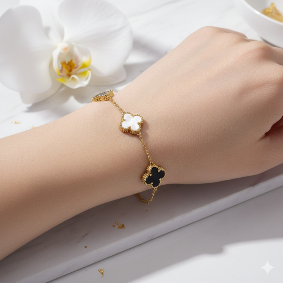 Elegant and versatile, this reversible clover charm bracelet is designed to adapt effortlessly to your style. Featuring delicately framed clover motifs, the bracelet can be worn in multiple ways — showcasing a full white pendant look, a full black pendant look, or a chic black-and-white combination.