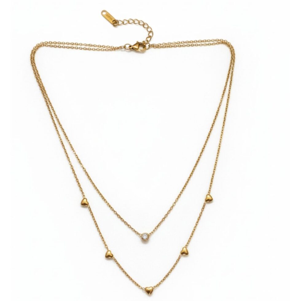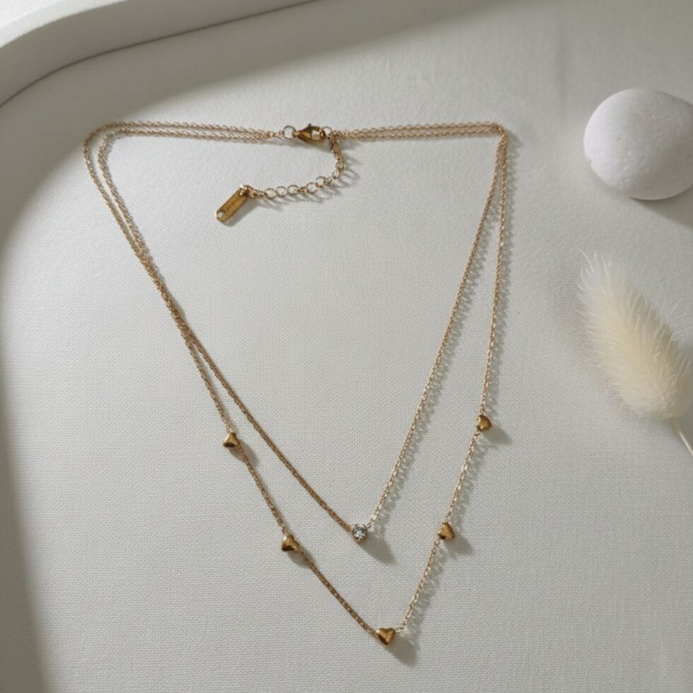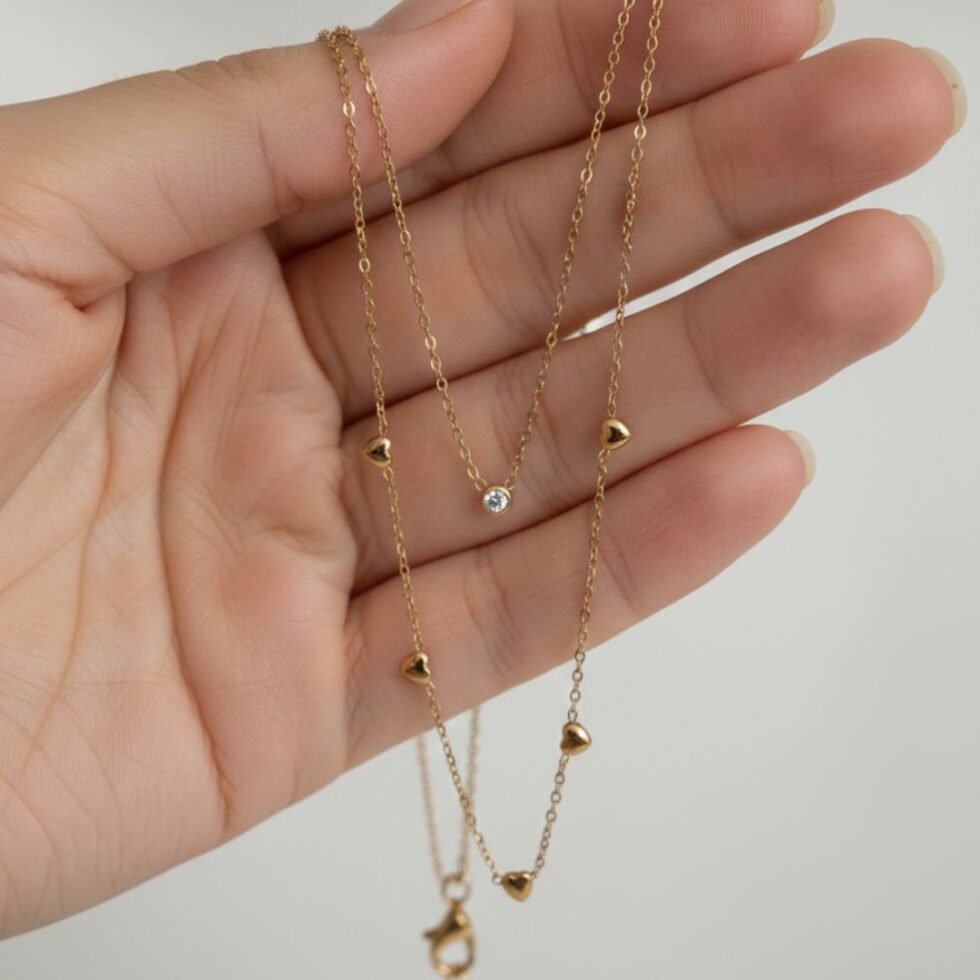 Sweetheart Layered Charm Necklace with Soft, playful, and beautifully detailed, this Beyond Basic necklace features a double-layer gold chain accented with tiny heart charms and a subtle crystal highlight. The spaced mini hearts create a gentle rhythm of shine, while the layered design adds depth without bulk.
