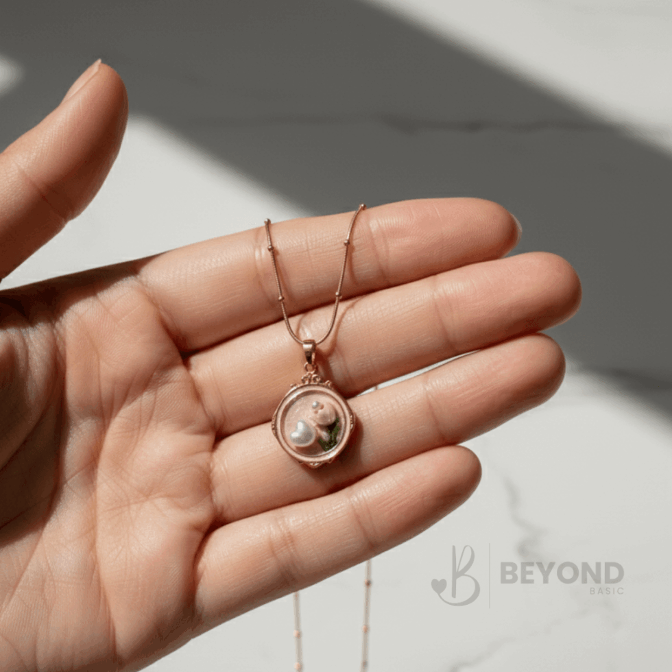 Channel your inner romantic with this stunning Beyond Basic vintage-style pendant. We designed this piece with a soft pink backdrop and delicate floral accents to bring a touch of old-world charm to your modern wardrobe. It’s that unique, “where did you get that?” piece that adds a soft, feminine glow to any look.