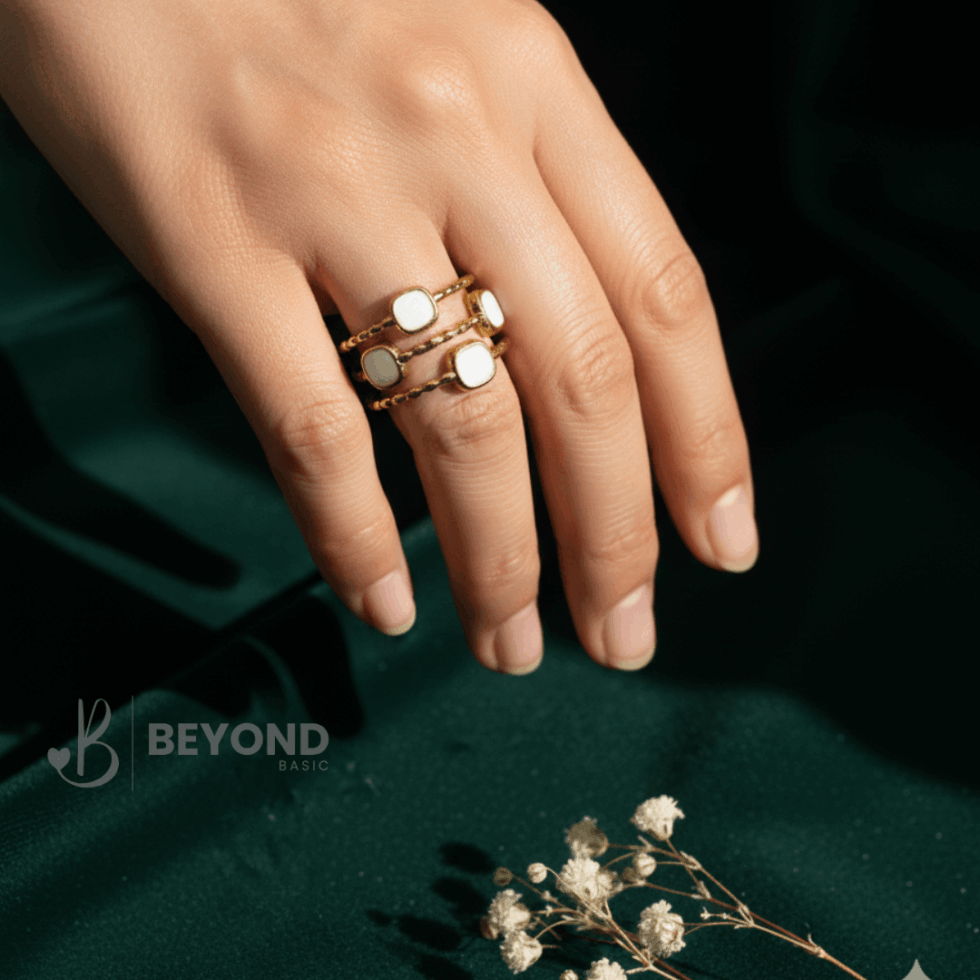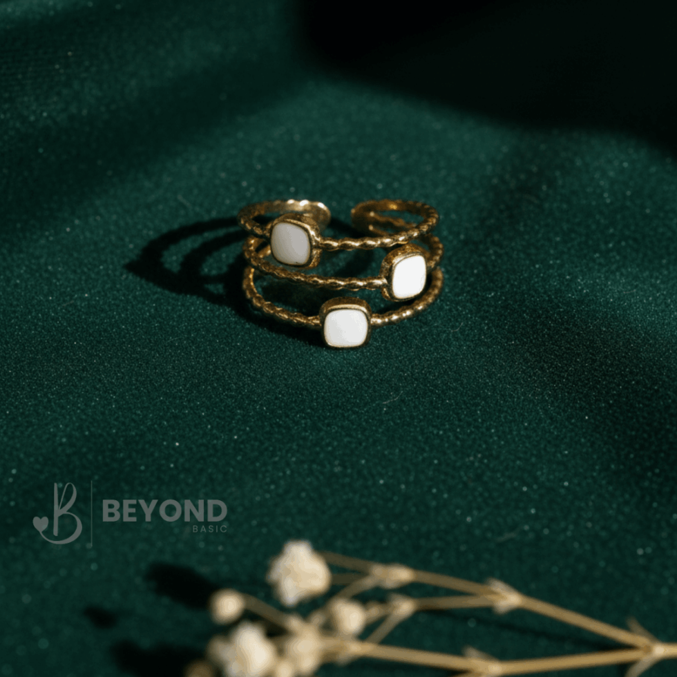 Modern and thoughtfully layered, this Beyond Basic ring features a triple-band design accented with smooth white enamel details. Each band is finished in a polished gold tone, creating a balanced contrast between clean enamel surfaces and delicate textured elements.